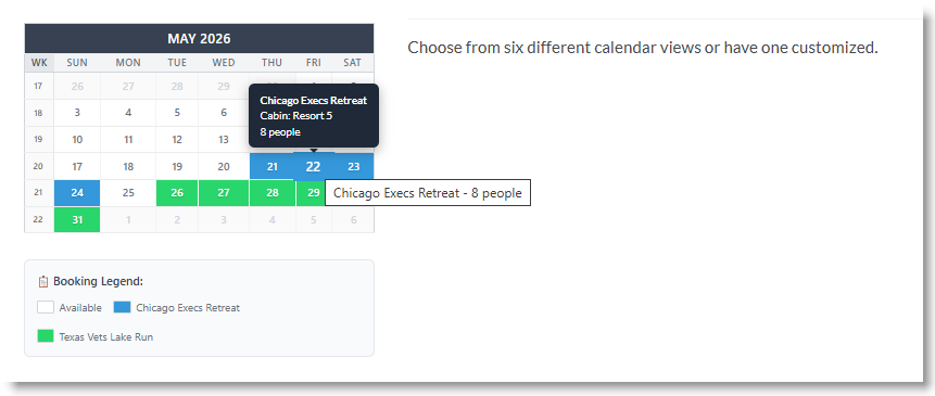 Choose from 8 different calendar styles to match different pages on your site, such as availability overview pages versus individual cabin detail pages. This offers more flexibility than the default options in WebRezPro's standardized templates.