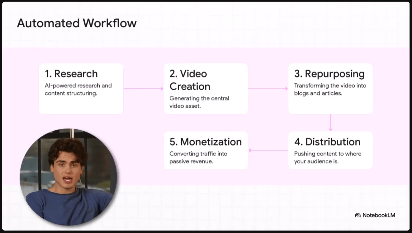 And this right here is the entire blueprint in five elegant steps. It all starts with AI doing the heavy lifting on research. That flows into creating one core video.