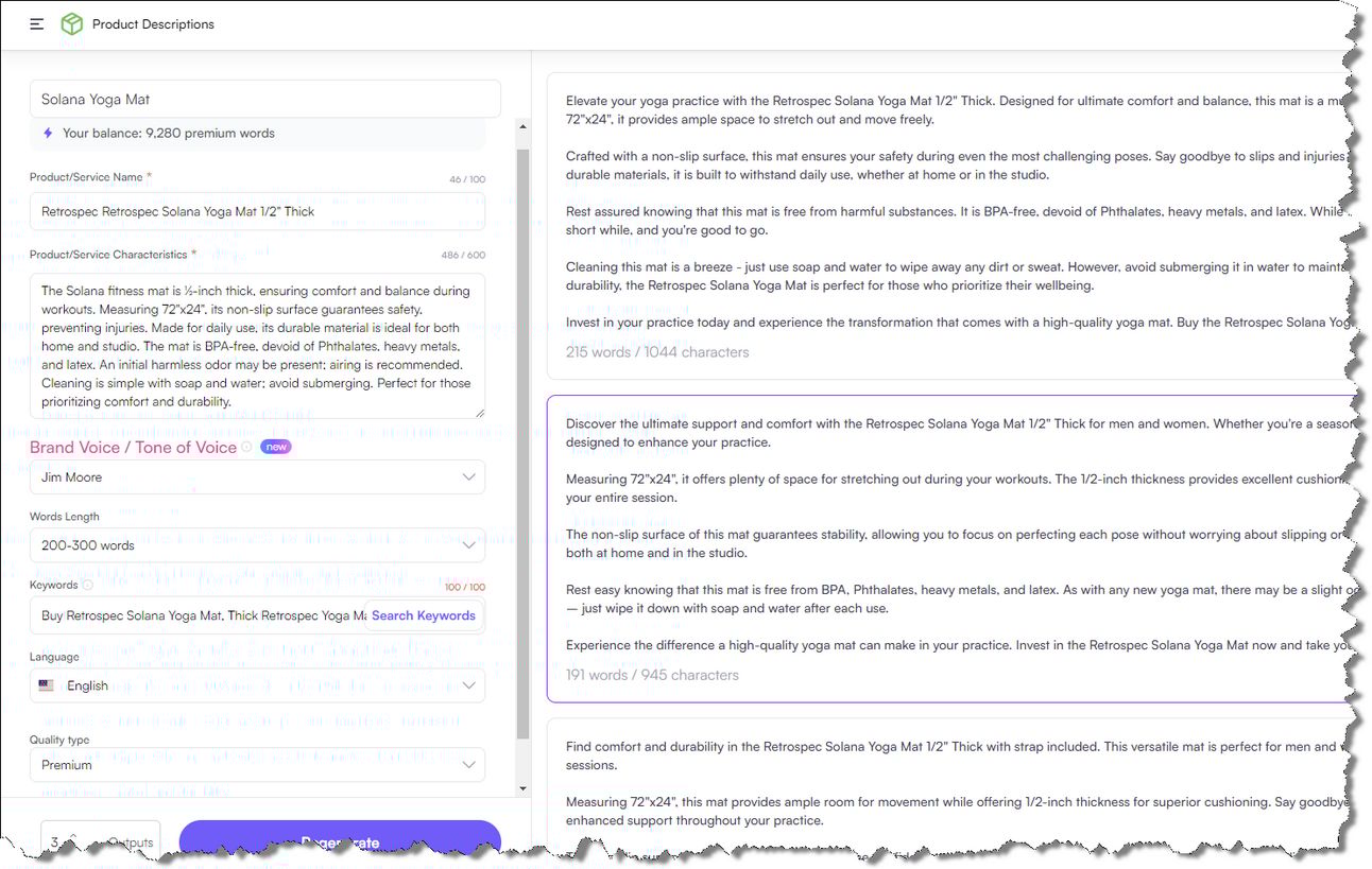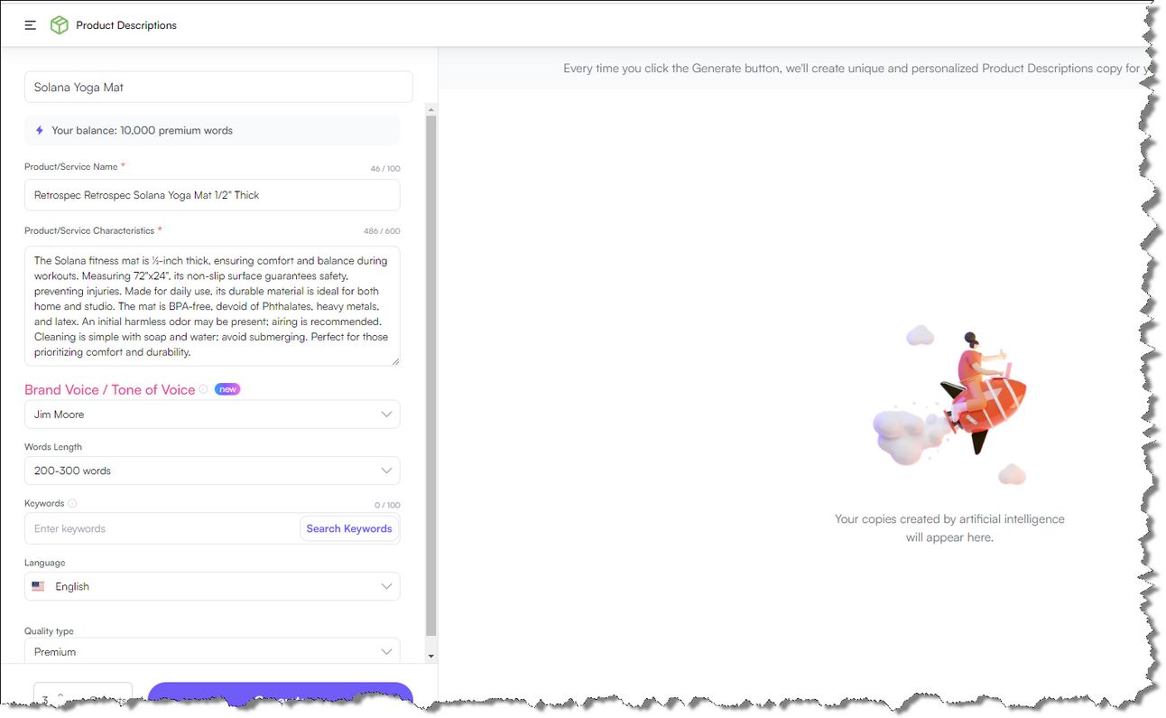 After setting up the branding voice, and pasting in a basic product description…