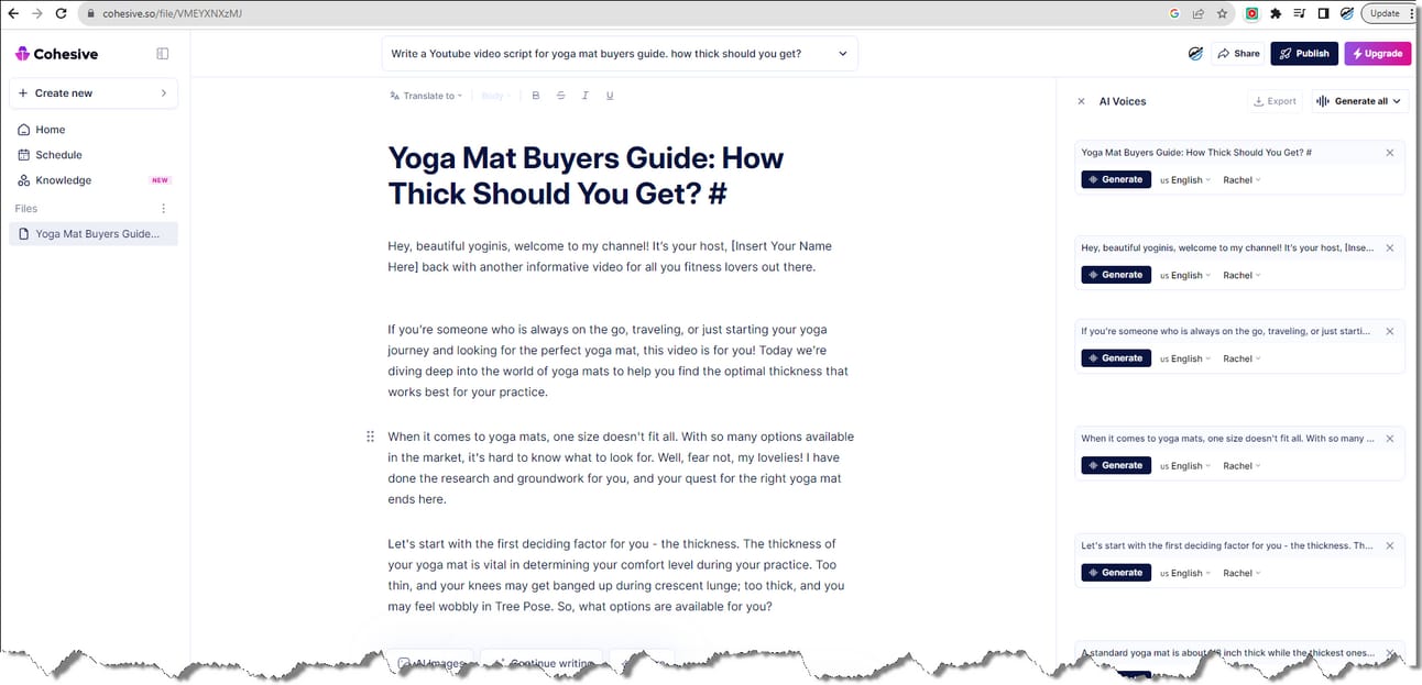 Task: Use Cohesive AI to generate a YouTube video transcript based on top-ranking yoga product review videos.