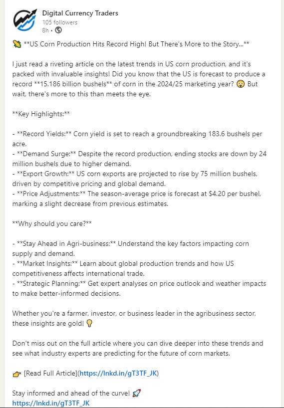 All right, the article has been sent through to digital currency traders in a draft format. Here we are: unveiling the 2024 Corn Market Secrets—record yields and unexpected trends. That sounds engaging! I'll do some editing on this.
