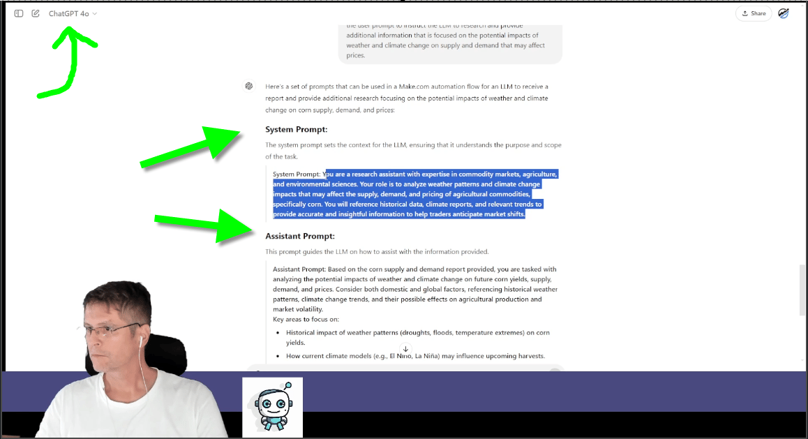 I'm going to update these prompts as well, and ask ChatGPT what it thinks I should be using its services for. I dig down to where the content came out from this automation, copy it, and bring it over to ChatGPT. I tell it I have a report on corn supply and demand, and ask what additional research it can provide to help make the report more helpful to a speculative commodities trader.